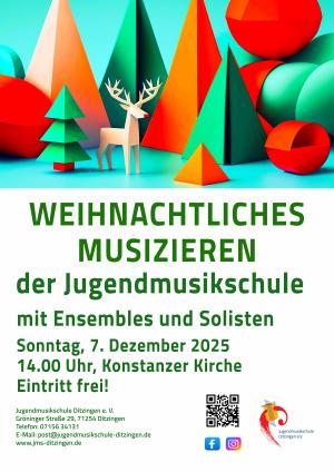 Im Rahmen des Ditzinger Adventszaubers musizieren auch in diesem Jahr Ensembles, Orchester und Chöre der Jugendmusikschule ab 14 Uhr in der Konstanzer Kirche. Wir laden Sie herzlich ein, sich bei besinnlichen und auch beschwingten Stücken auf Advent und Weihnachten einzustimmen. Der Eintritt ist frei – wir freuen uns auf Ihr Kommen!